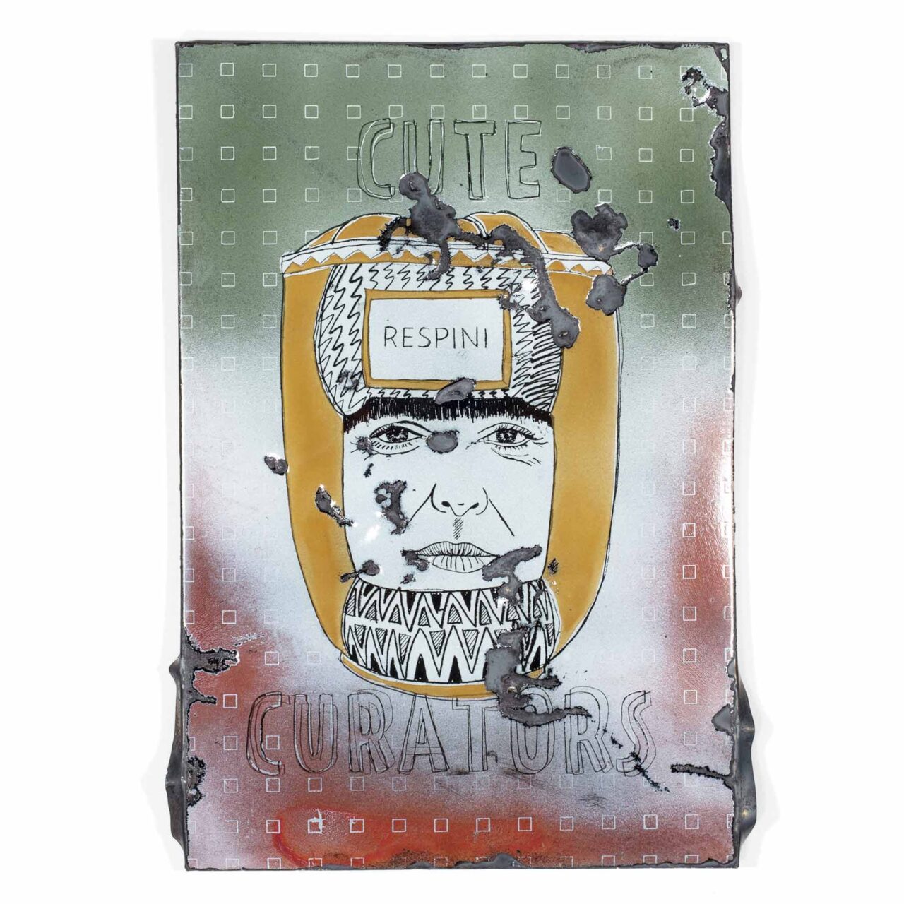 Shows a series of the world’s most important curators on enameled steel sheets. The curators were first individually elaborately drawn, fired and later destroyed by Meyer, because they never invited him to exhibitions (except for deceased curators). After the destruction process, the sheets were burned again.