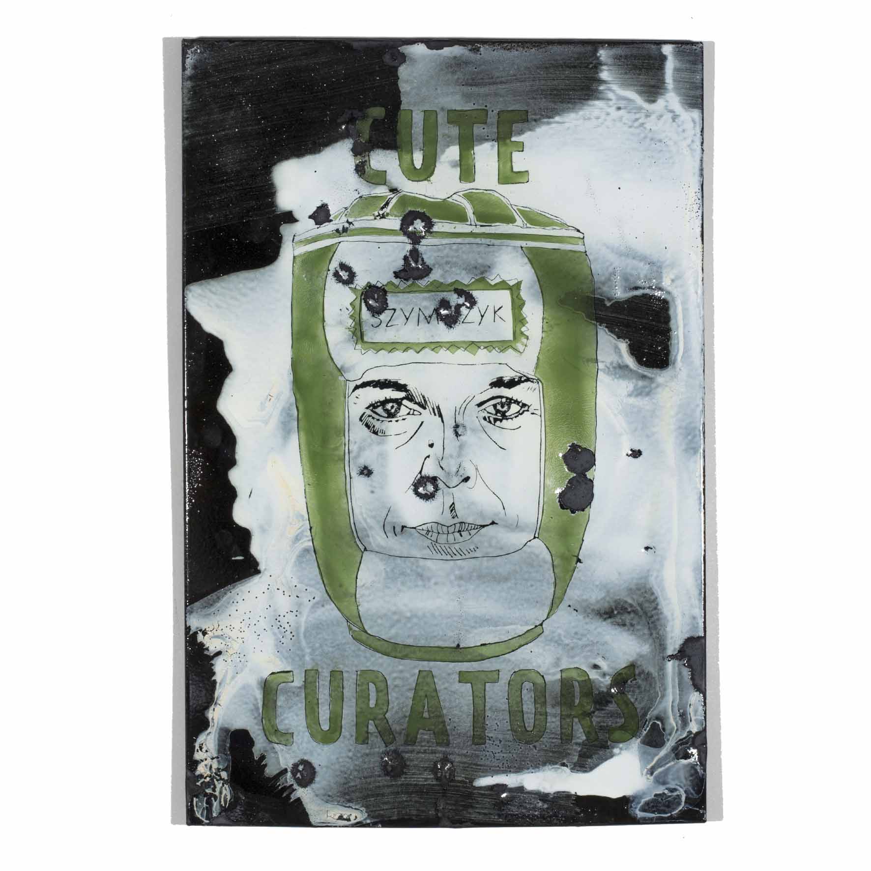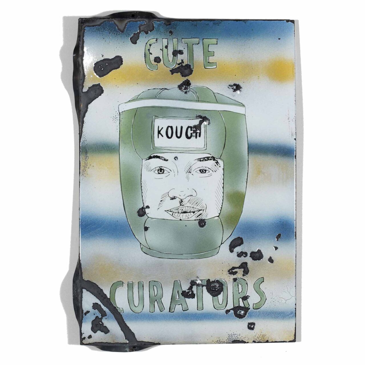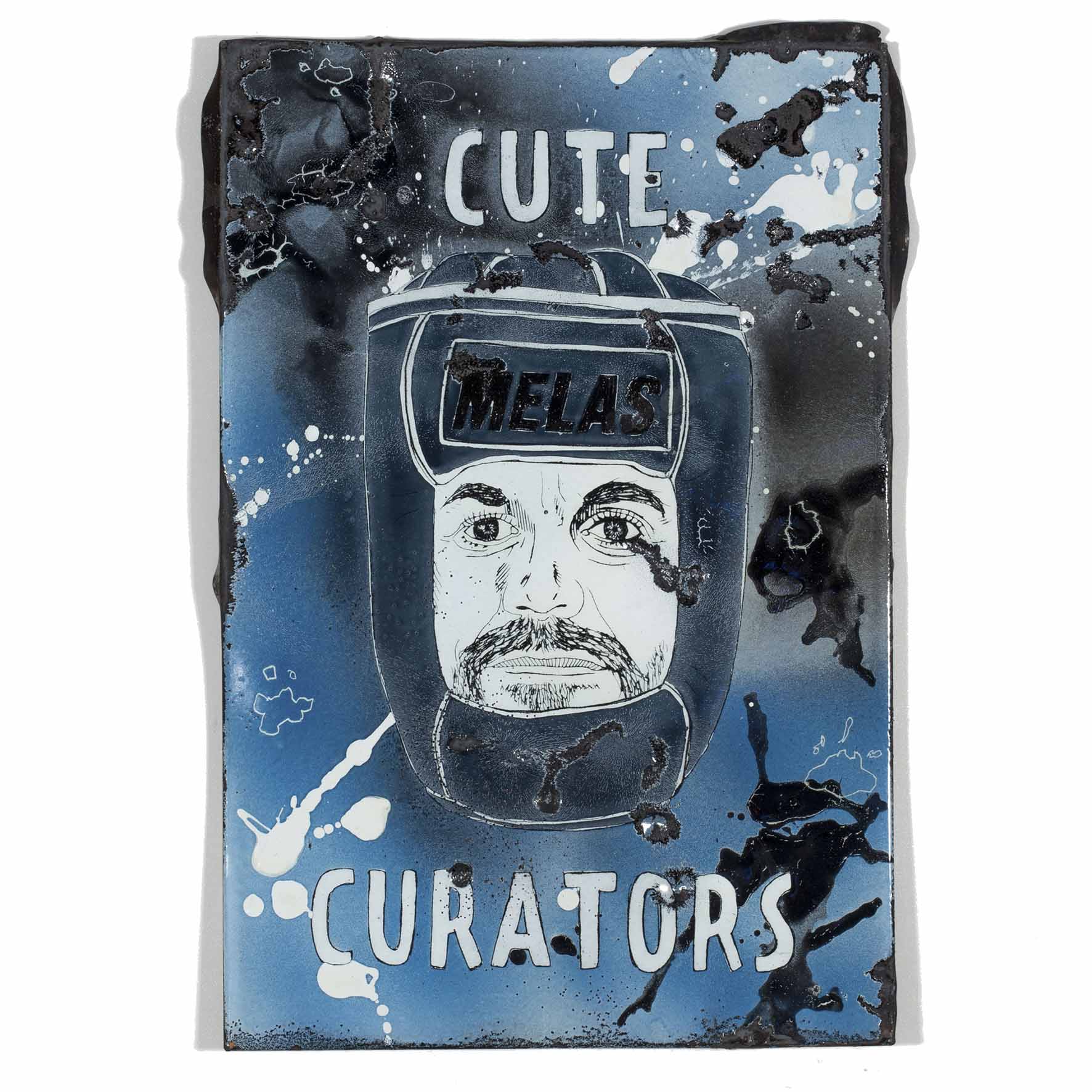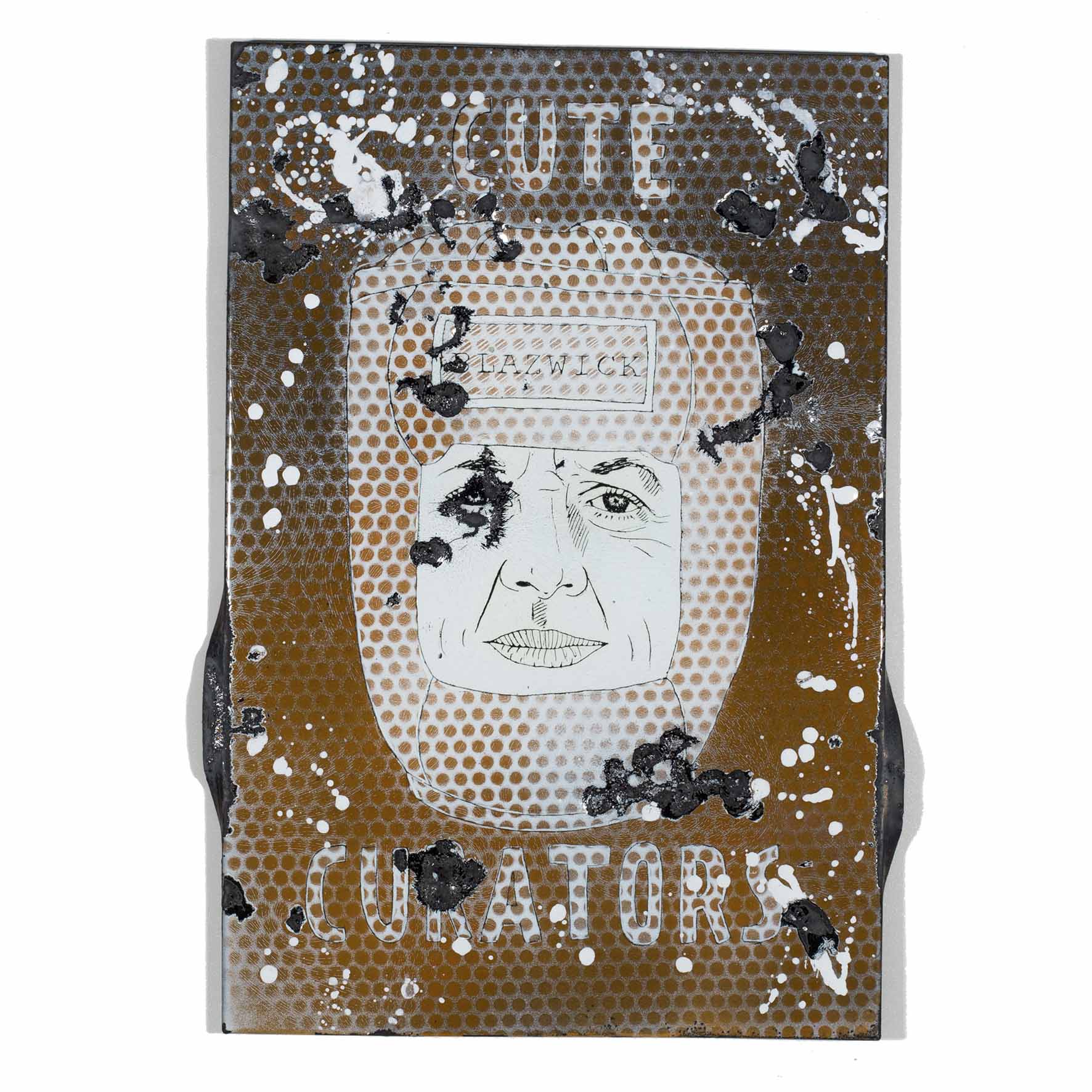 Shows a series of the world’s most important curators on enameled steel sheets. The curators were first individually elaborately drawn, fired and later destroyed by Meyer, because they never invited him to exhibitions (except for deceased curators). After the destruction process, the sheets were burned again.