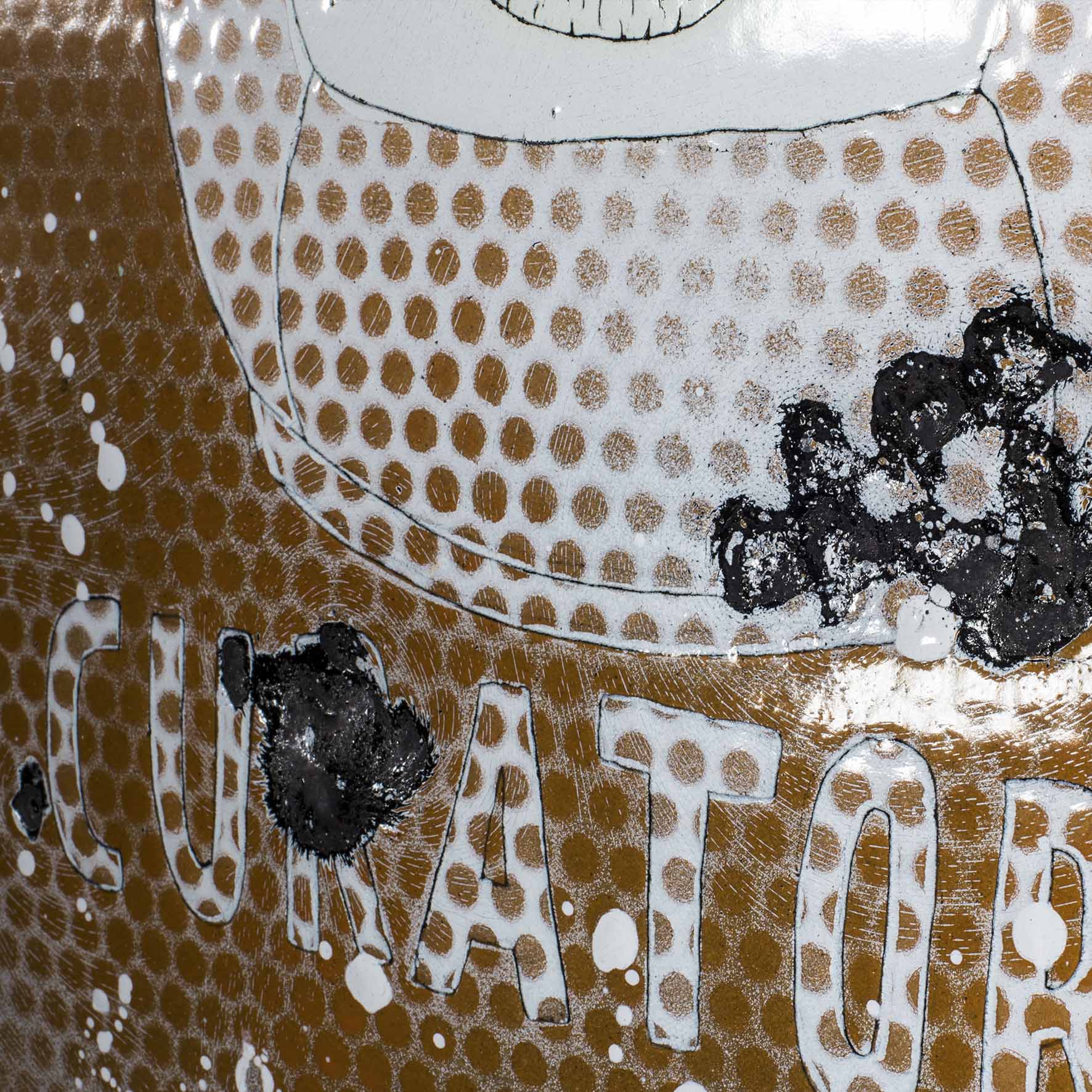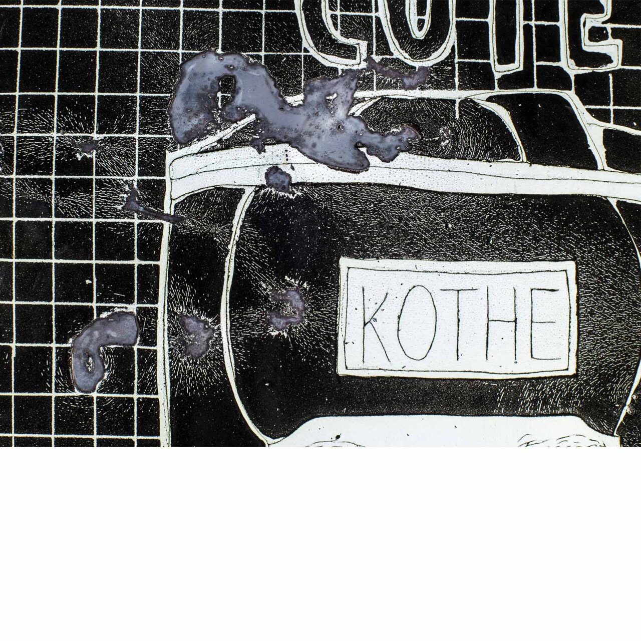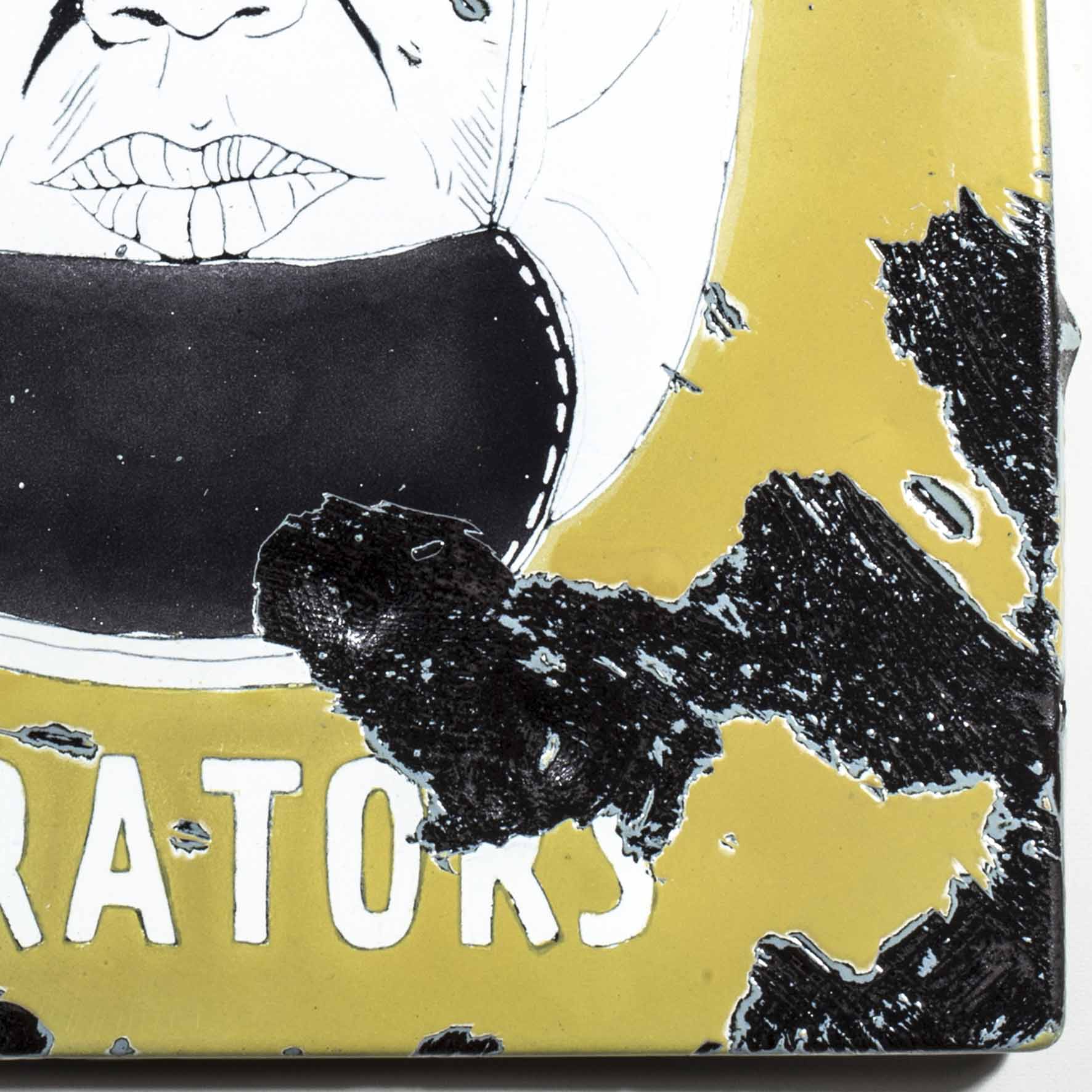 Shows a series of the world’s most important curators on enameled steel sheets. The curators were first individually elaborately drawn, fired and later destroyed by Meyer, because they never invited him to exhibitions (except for deceased curators). After the destruction process, the sheets were burned again.