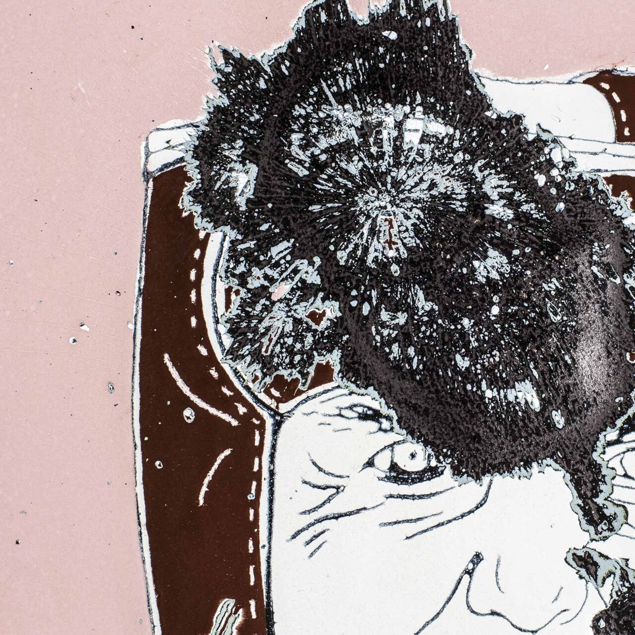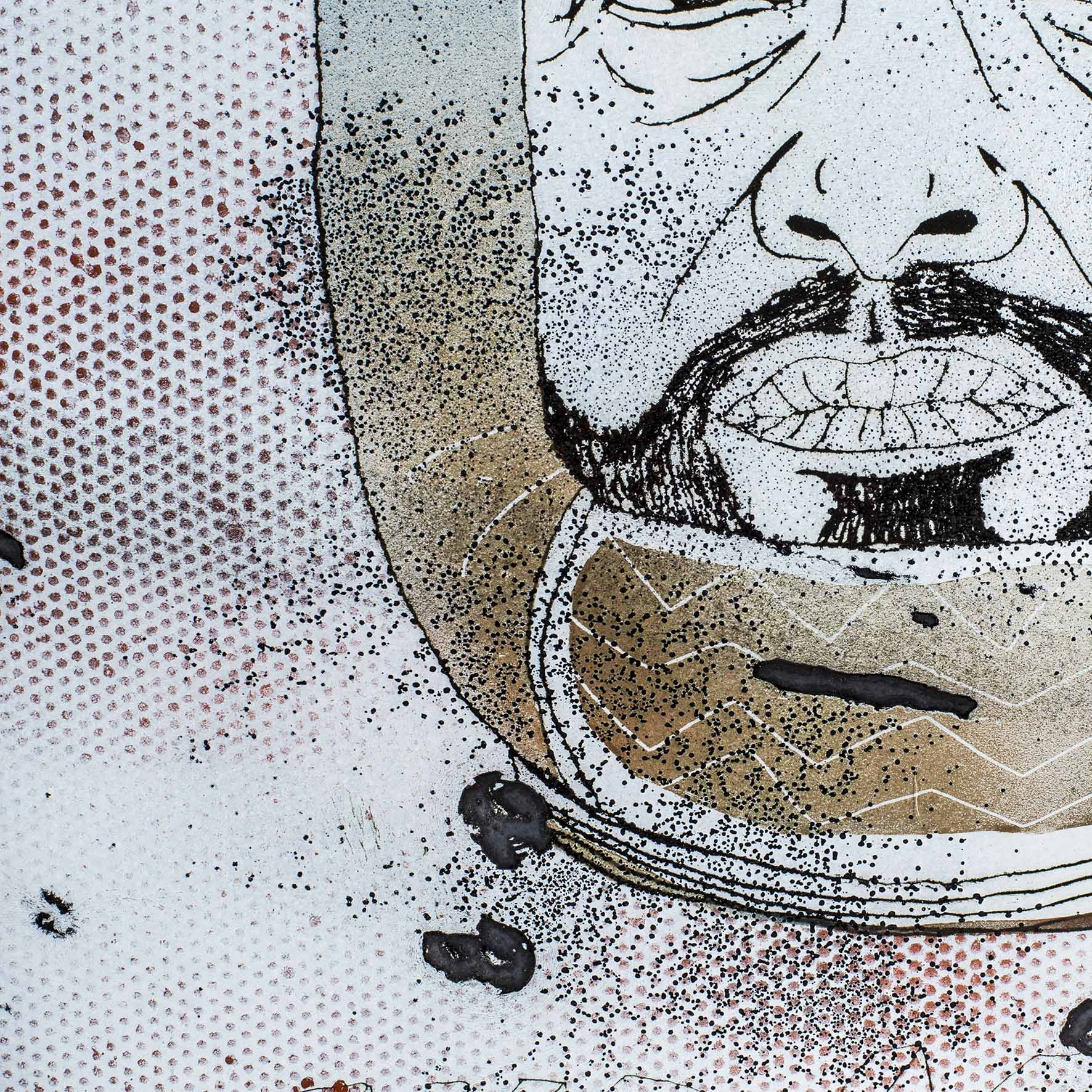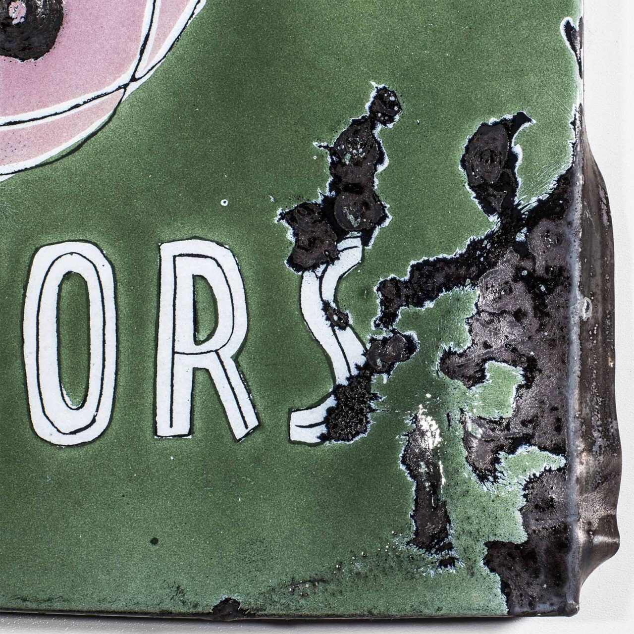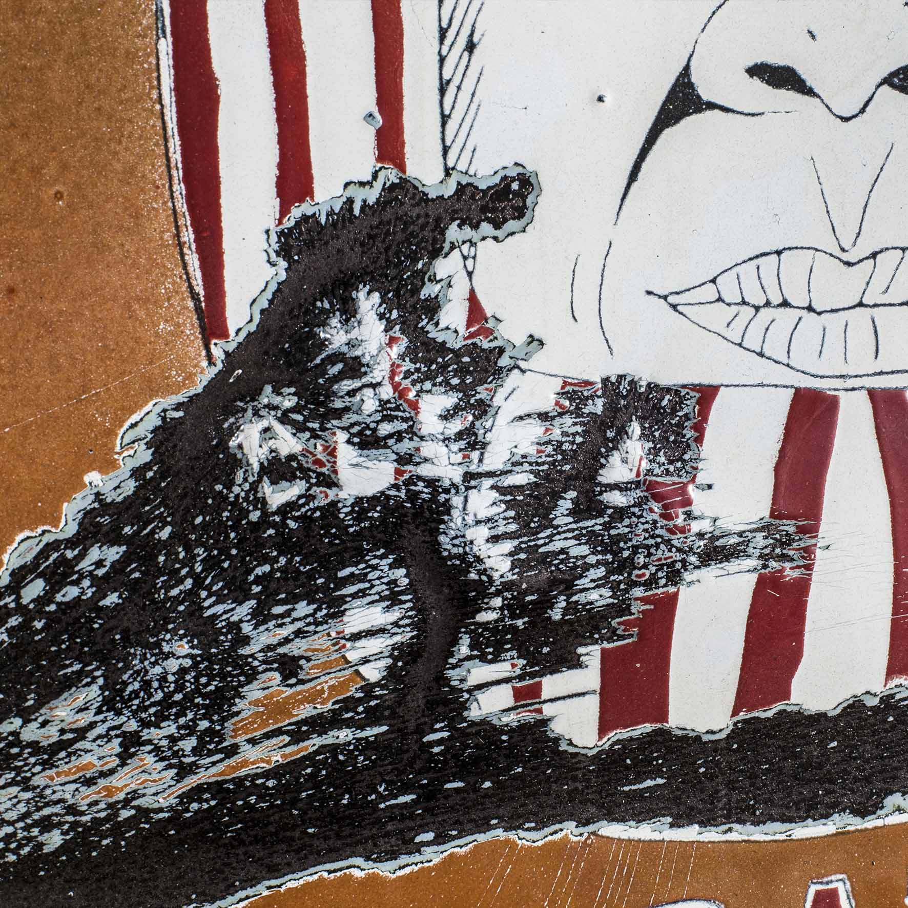Shows a series of the world’s most important curators on enameled steel sheets. The curators were first individually elaborately drawn, fired and later destroyed by Meyer, because they never invited him to exhibitions (except for deceased curators). After the destruction process, the sheets were burned again.